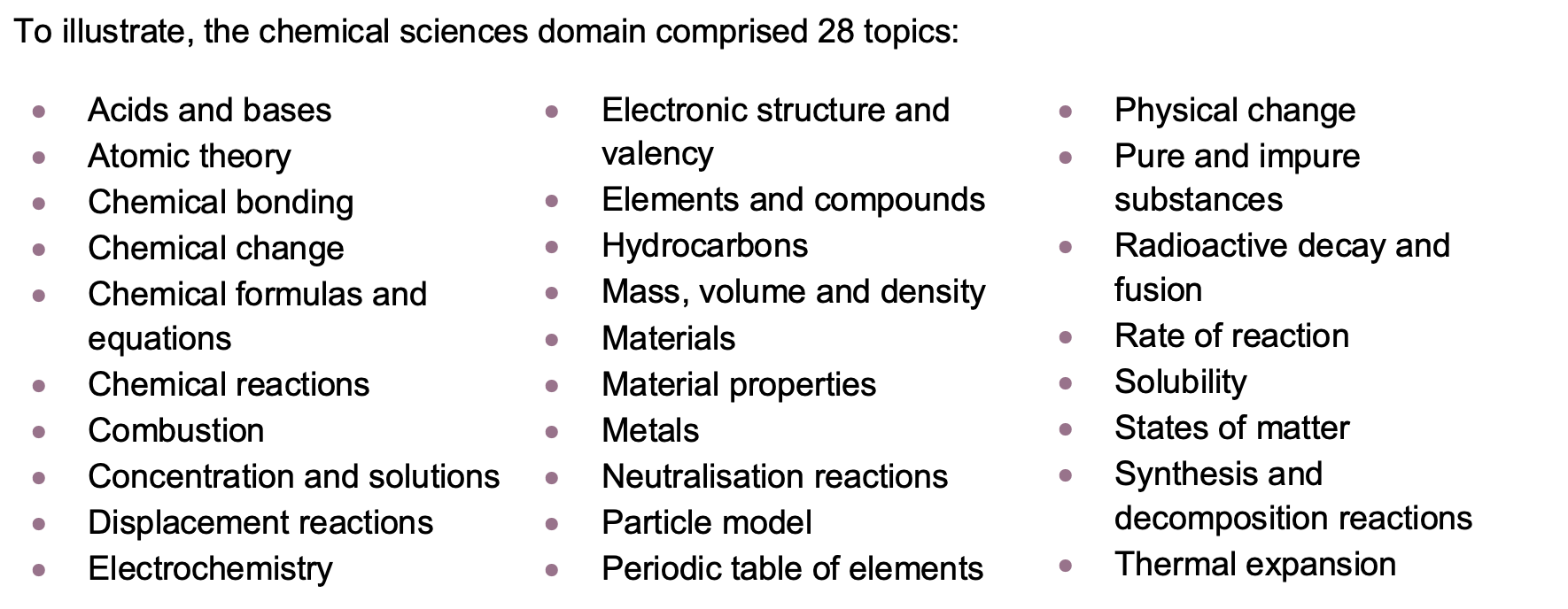 The identification of these topics was supposedly confirmed by curriculum experts, data analysts and science teachers. But the list raises more questions than answers. Why are materials covered separately to material properties? Why are metals singled out? This is the result of the bottom-up methodology employed, which began with “content items” (discrete pieces of science knowledge) and grouped them into topics.